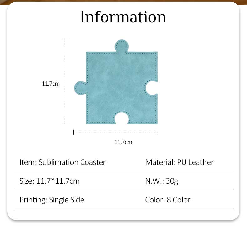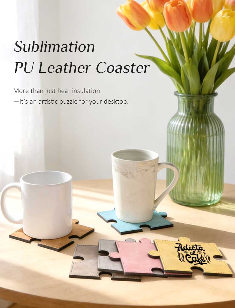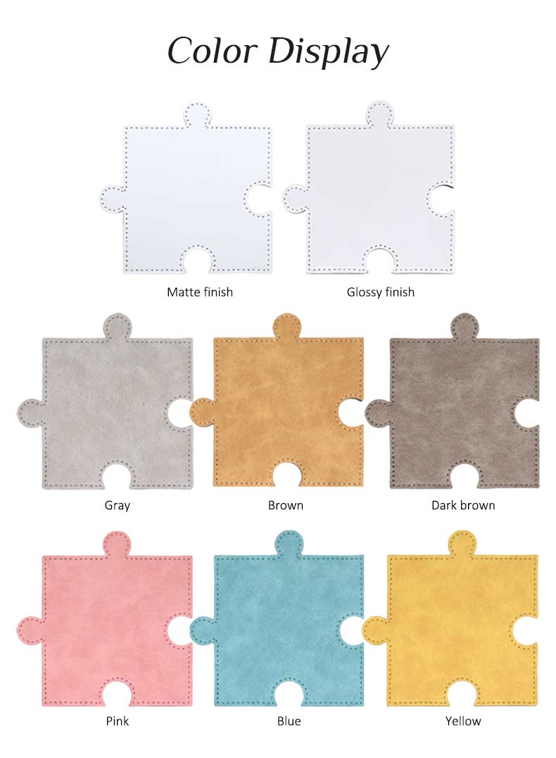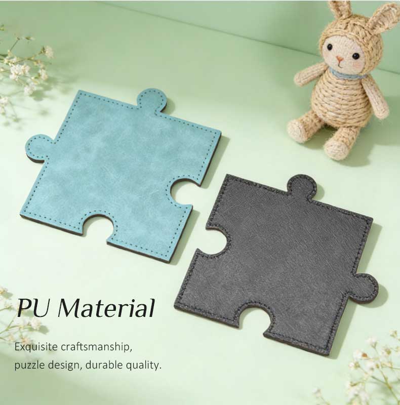 This sublimation blank PU leather puzzle coaster set is a creative, customizable table accessory crafted from premium PU leather, designed for heat insulation and artistic decoration.