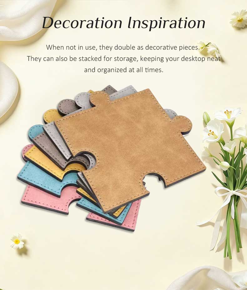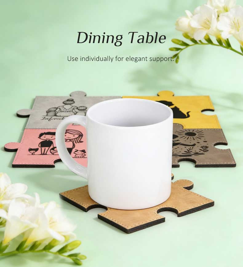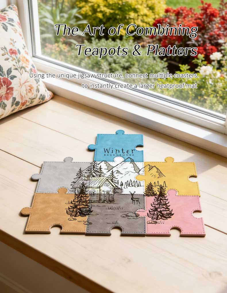 The interlocking puzzle structure allows multiple coasters to be connected into a large heatproof mat, while the high-quality PU leather provides excellent heat insulation, protecting tables from hot drinks and scratches.