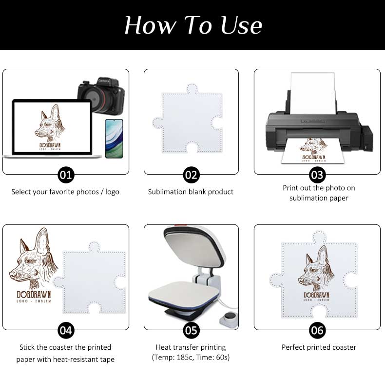 Each coaster measures 11.7×11.7cm (30g), features a unique interlocking jigsaw design, and is available in 8 vibrant colors, with a smooth blank surface optimized for single-sided sublimation heat transfer printing.