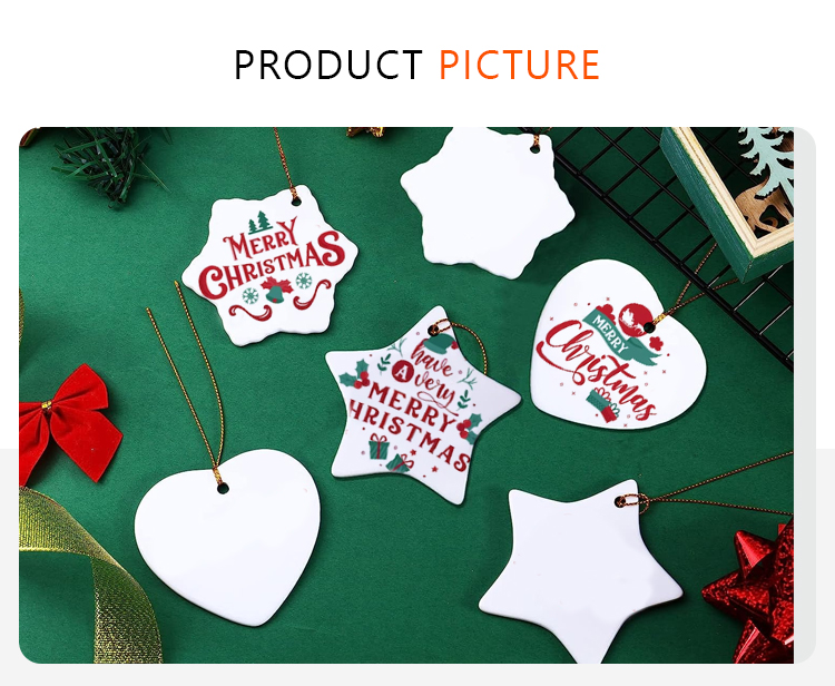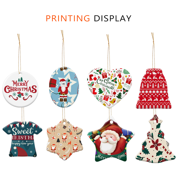 1. Material: Ceramic 2. 11 Fashion Shapes Available 3. Good for sublimation printing. 4. Premium Sublimation Ornament 5. OEM orders and buyers' specifications and decal designs are welcome. 6. Strictly control the quality and Production Delivery on time. 7. Welcome Your Order For Testing. 8. All Christmas Orament Series Products