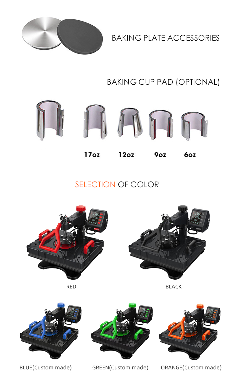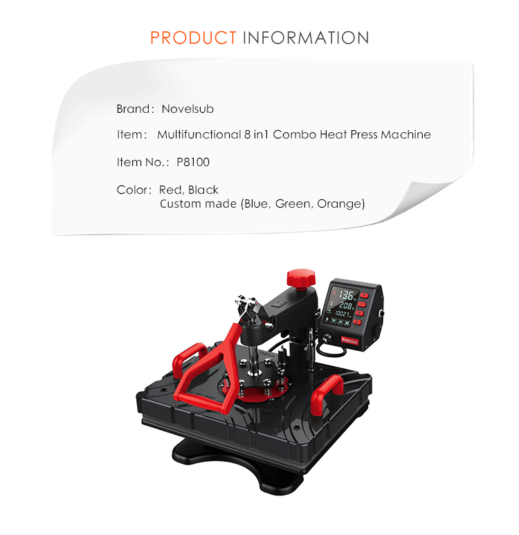 Multifunction combo 8 in 1 heat press provides a big surface to create your own custom T-shirt, special thickened heating plate make the printing more fastness and steady. The package includes all of the must-have attachments.It can transfer your pictures and characters of sublimating and dissolved printing ink onto T-shirts, mugs, coasters, mouse pads, ceramic plates, caps, lettering,fabrics & materials, jigsaw puzzles,etc.