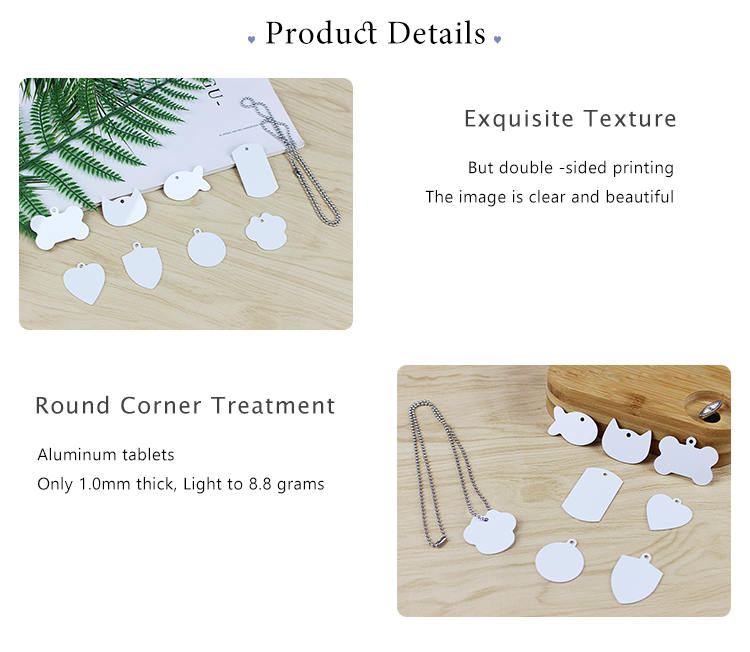 1. The light is soft, the vision and the printing is clear. 2. Aluminum sheet has wear resistance and good stability. 3.Aluminum board has excellent weather resistance and good high temperature performance. 4.Application: Personal Gifts, Lovers Gifts, Luggage Tags, Reserved Seating Tags, Wedding Place Cards.