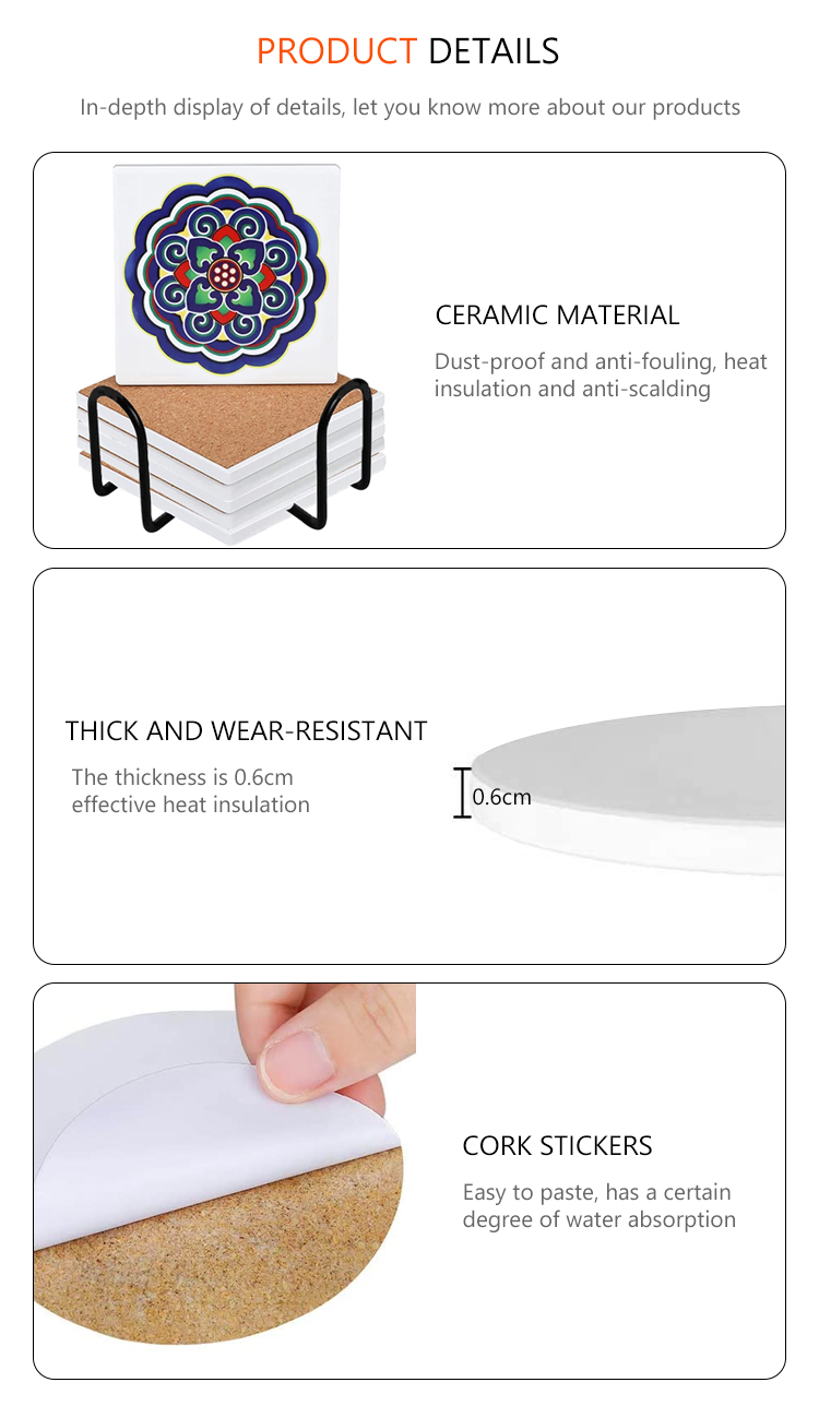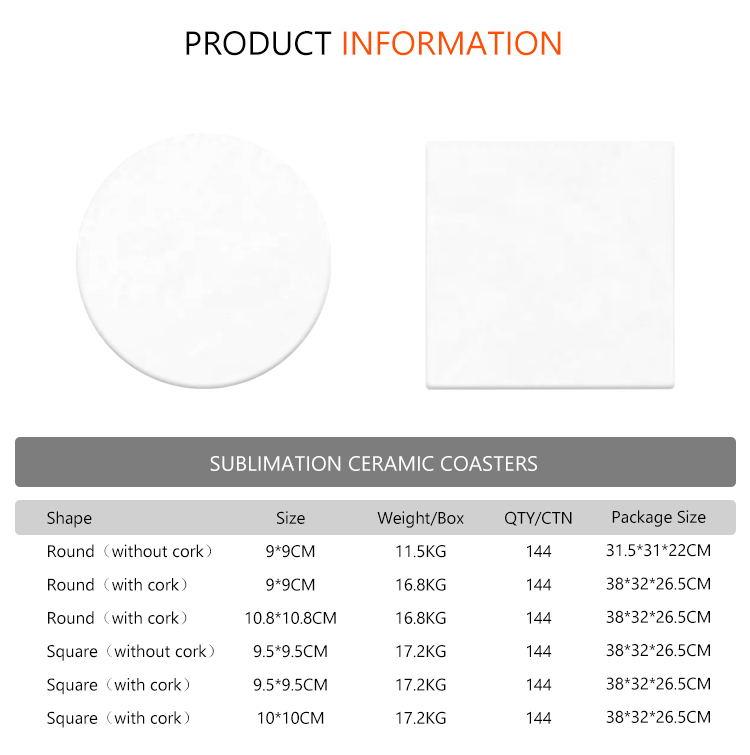 New Arrival Sublimation Coasters DIY Square/Round Ceramic Cup Pad with Cork