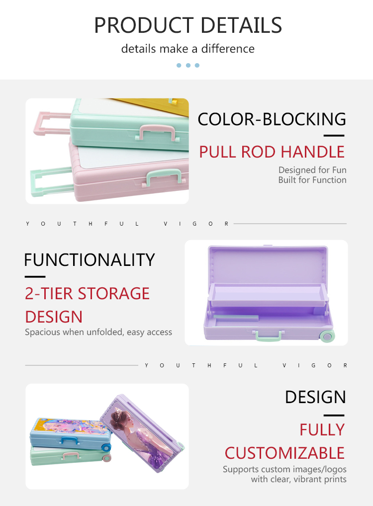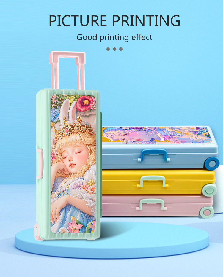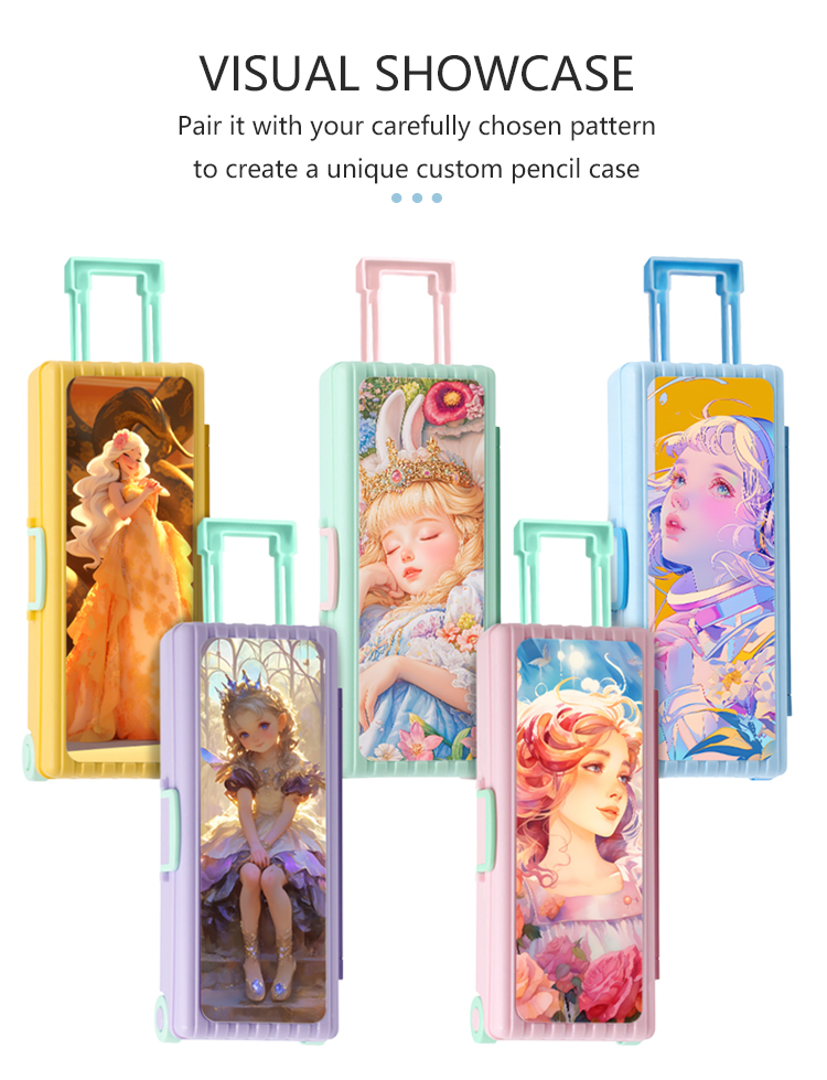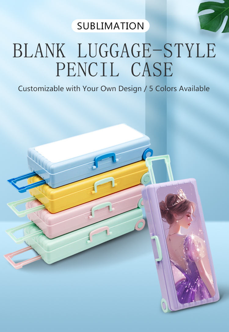 This fun, luggage-inspired pencil case combines playful design with customizable potential, made from durable plastic and available in 5 vibrant colors. Its large, smooth blank surface (18.6*6.6cm) is ideal for heat transfer printing, letting you add custom art, photos, or logos to create a unique stationery organizer for kids, students, or anyone who loves personalized accessories.
