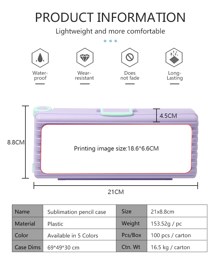 The multi-layer design offers spacious storage for pens, pencils, rulers, and other small supplies, while the secure snap closure keeps items safe. With a compact 21*8.8cm size and lightweight build (153.52g), it’s easy to carry in backpacks or bags. Whether for school, office, or craft projects, this sublimation pencil case blends practical storage with creative flair, making it a great gift or promotional item.