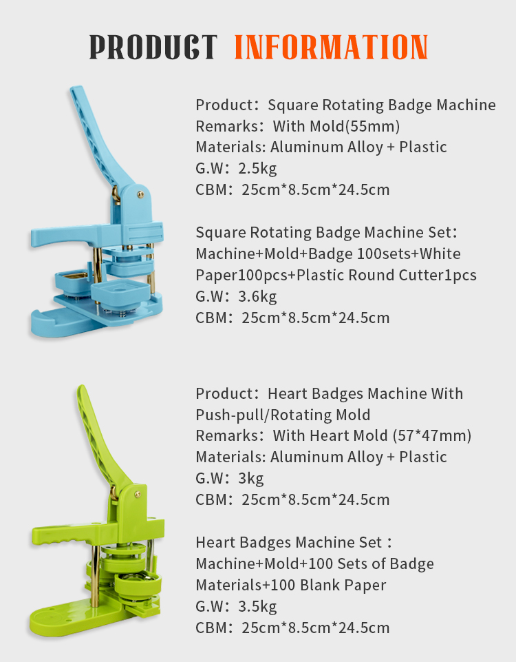A set includes Machine+Mold+ 50x50mm badges 100 sets+ white paper 100 pcs