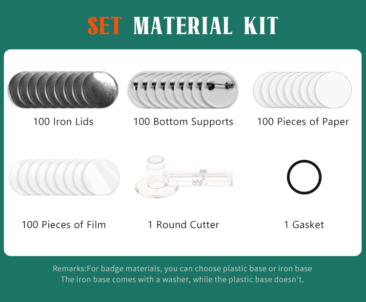 A set includes Machine+Mold+ 100 sets of badge materials+100 white paper
